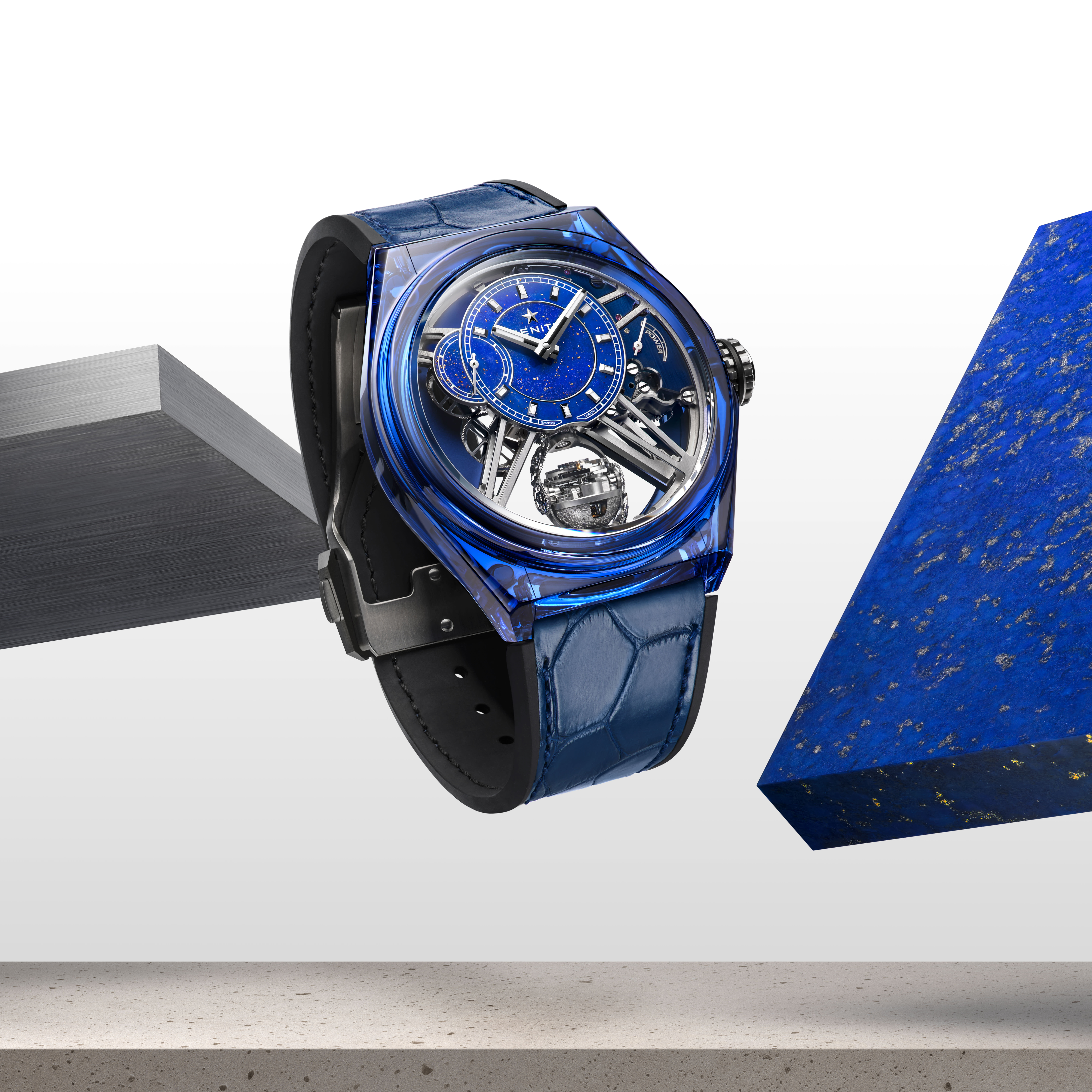 Le boîtier en saphir, disponible en bleu céleste ou entièrement verre transparent, révèle la beauté du mouvement ajouré sous tous les angles. Le cadran en lapis-lazuli, parsemé de pyrite dorée, évoque le ciel nocturne — chaque pièce étant ornée de manière unique par l'art de la nature.
