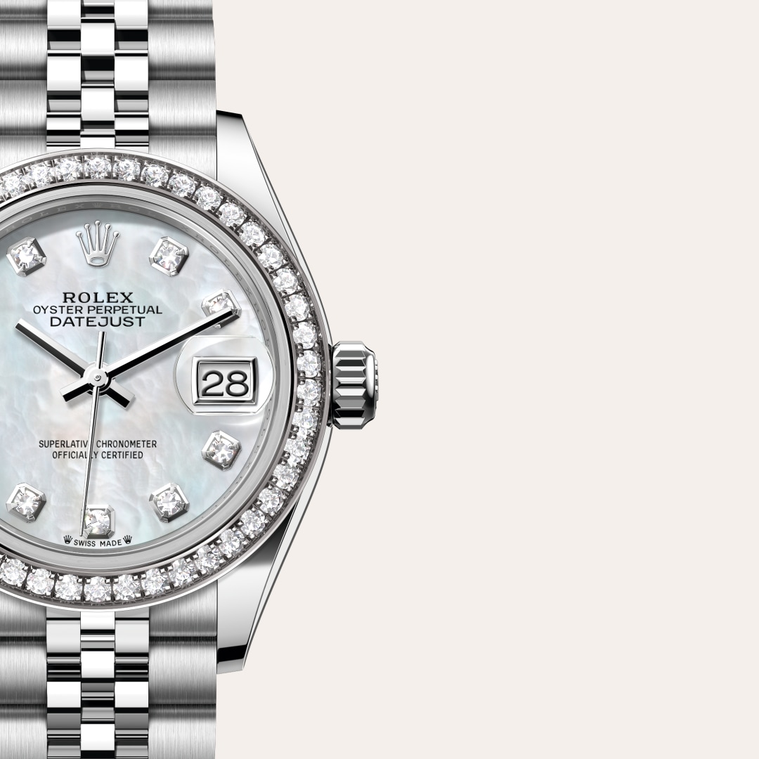 This dial features diamonds in 18 ct gold settings. Mother-of-pearl is by its nature full of mystery and surprises. Depending on its origin, it can be pink, white, black or yellow. It differs in colour, intensity and structure according to the part of the shell from which it is extracted. At Rolex, mother-of-pearl is never artificially coloured. Instead, particular know-how and skill are devoted to simply highlighting its natural beauty and preserving the original hues. As all mother-of-pearl dials are unique pieces, an identical dial will never be found on another wrist.