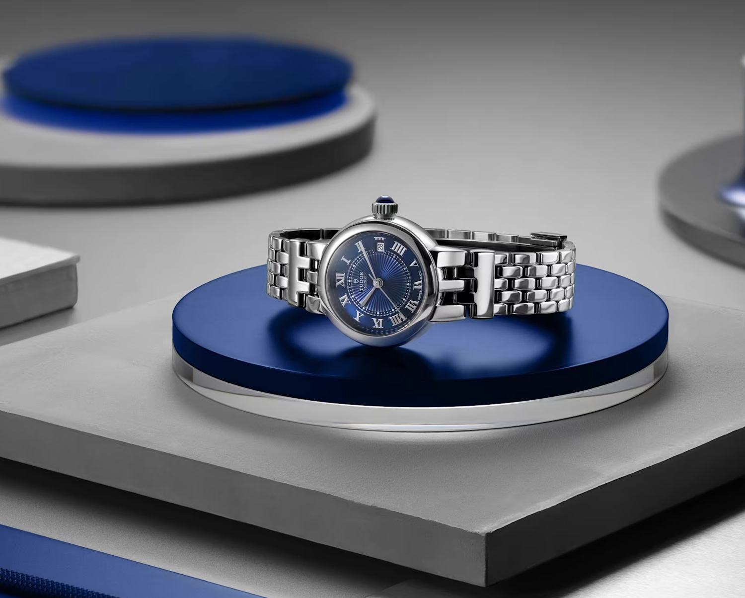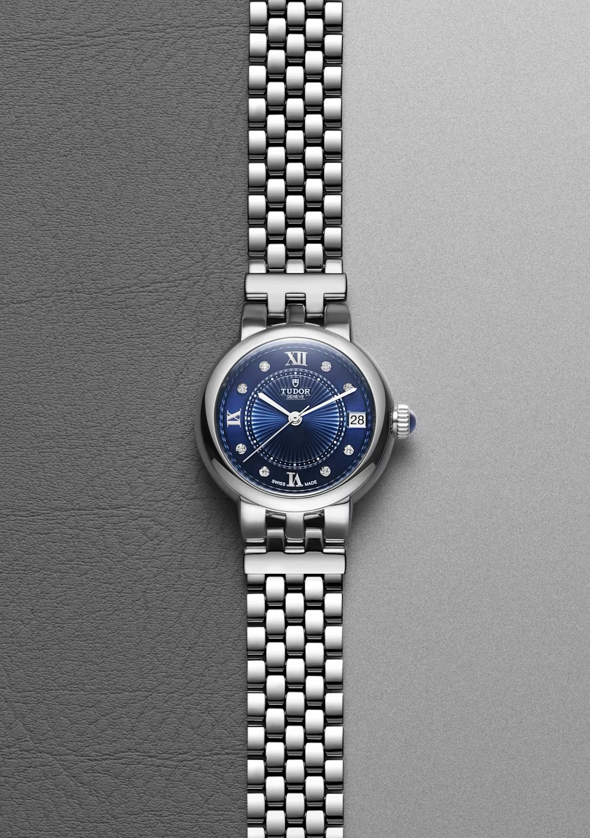 In 2024, the Clair de Rose line introduces the brand-signature "TUDOR Blue" dial, featuring delicate relief decorations. These dials are punctuated with Roman numerals or diamond hour markers, enhancing the watch's graceful aesthetic. The "TUDOR Blue" hue pays homage to the brand's historic use of blue since 1969, adding a contemporary touch to this classic design.